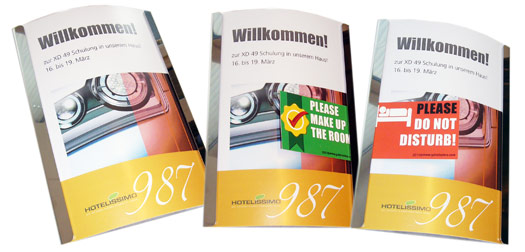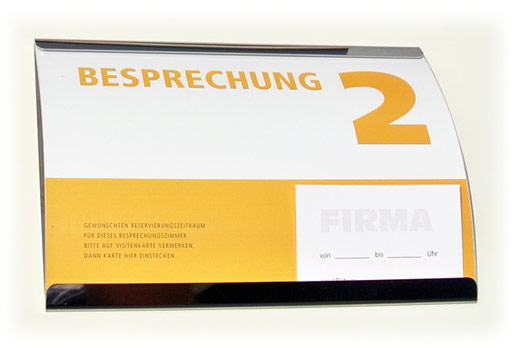 Wer einen Besprechungsraum reserviert hat, kann ihn durch Einstecken eines gedruckten oder handbeschriebenen Kärtchens bzw. seiner Visitenkarte als reserviert kennzeichnen. Heute schon für morgen!